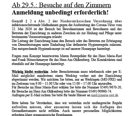 bernholt2020-05-29 08:00:502020-05-29 14:53:09Besuche auf den Zimmern / Anmeldung unbedingt erforderlich!